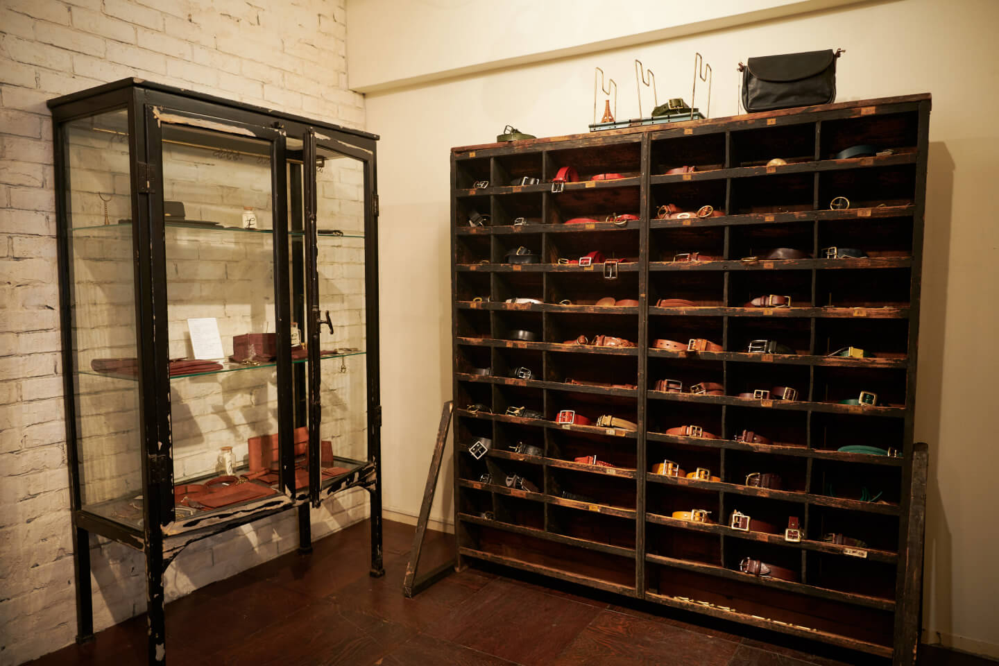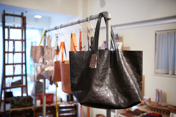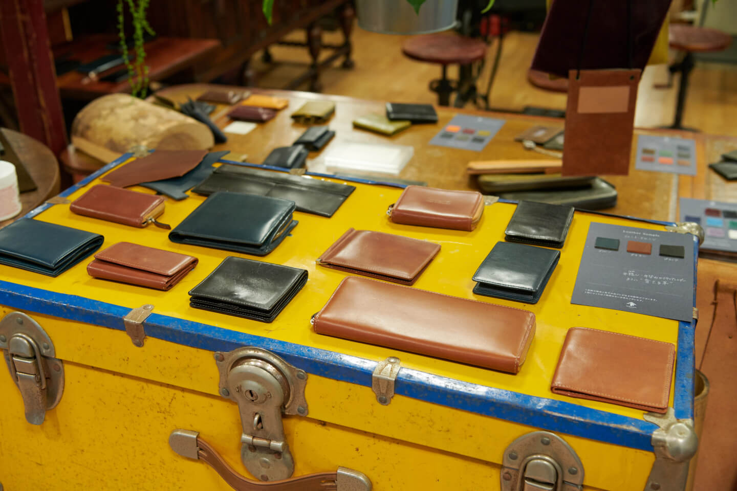 栃木レザーのヌメ革や顔料を四層に重ねたバフィングシリーズなど、エイジングを楽しめる素材使いが好評。