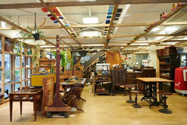 1899年創業の老舗財布メーカーのアトリエ&ショップ。革製品はもちろん、歴史的な機械などもフォトジェニック。