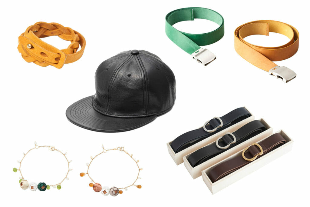 着こなしの絶妙なスパイスになり、鮮度アップにも貢献してくれるレザー製のファッションアイテム。今回セレクトした帽子やベルト、アクセサリーはスタイリングにも取り入れやすく、ポイント使いにもぴったり!