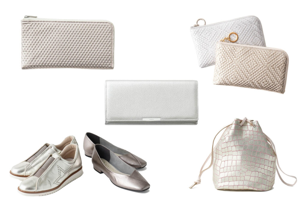 財布やミニショルダーバッグといったコンパクトなアイテムでも、美しい煌めきを放つシャイニーカラーなら存在感は格別。華やかなスパイスになってくれるのはもちろん、旬度の高いコーディネートへと導いてくれるはず。