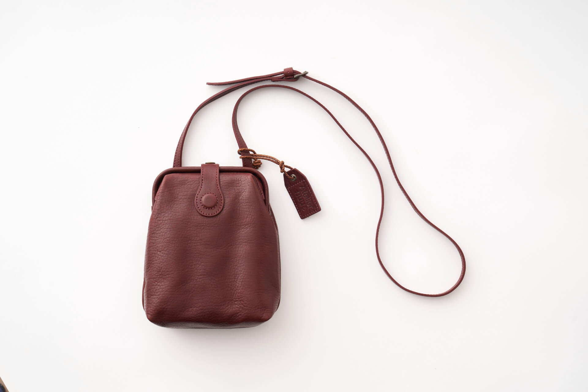 ワインの絞りかすで染めた「レッザボタニカ®︎ビーノ」製のポシェット型のダレスバッグ。ポリフェノール成分によってより深みのある色を実現し、丈夫さとしなやかさも併せ持つ。