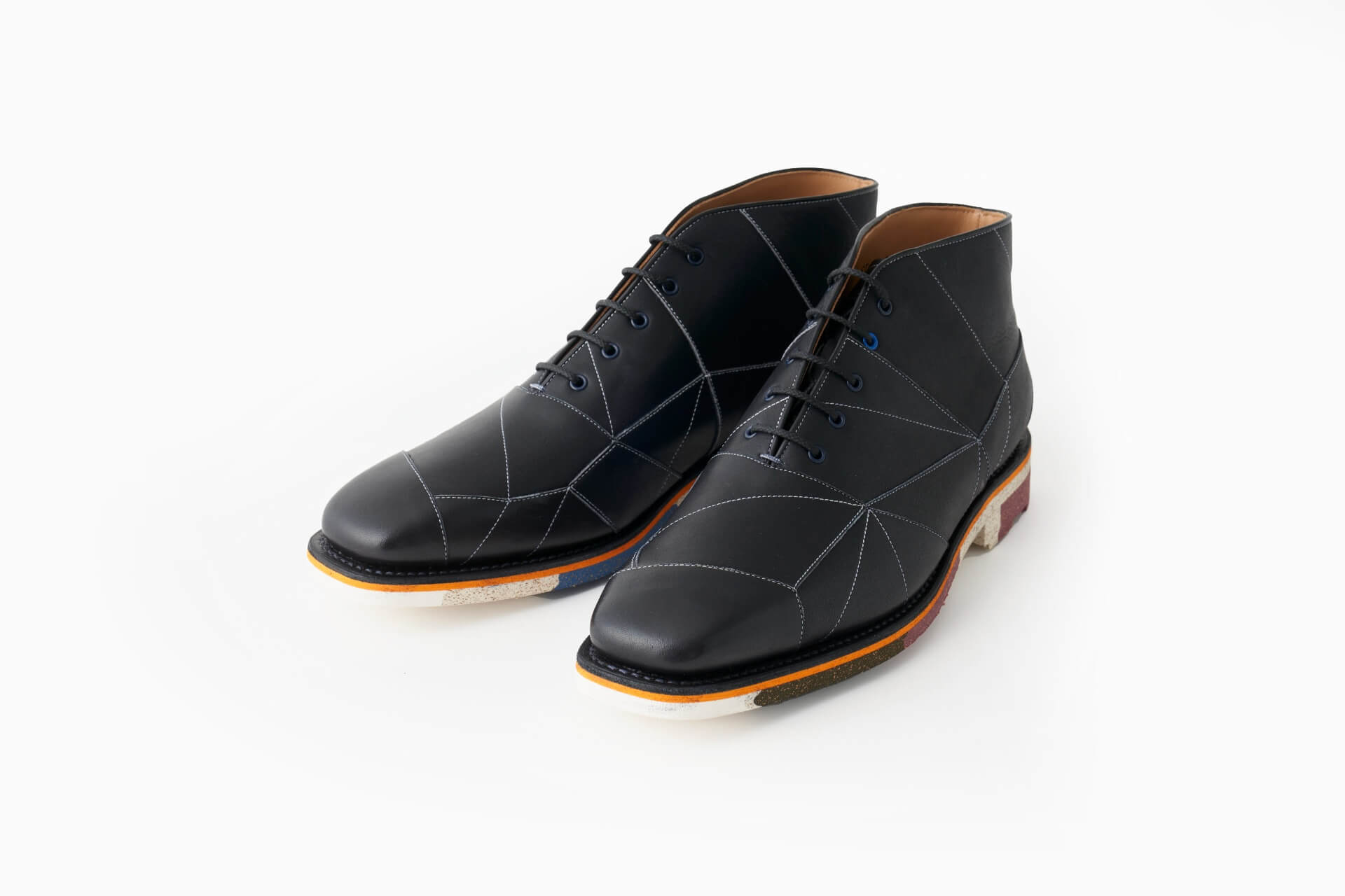 奄美大島の伝統的な染色技法である藍泥染を取り入れた、渋みのある独特な色味のレザーを採用。それによってスパイダーデザインもどこか優雅に見え、気品漂う足元を演出する。