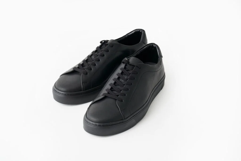 クラシカルなデザインとオールレザー製が相まって、スニーカーながら革靴感覚で取り入れられる。アッパーからビブラムソールまで、ブラックで統一しているところも見どころ。