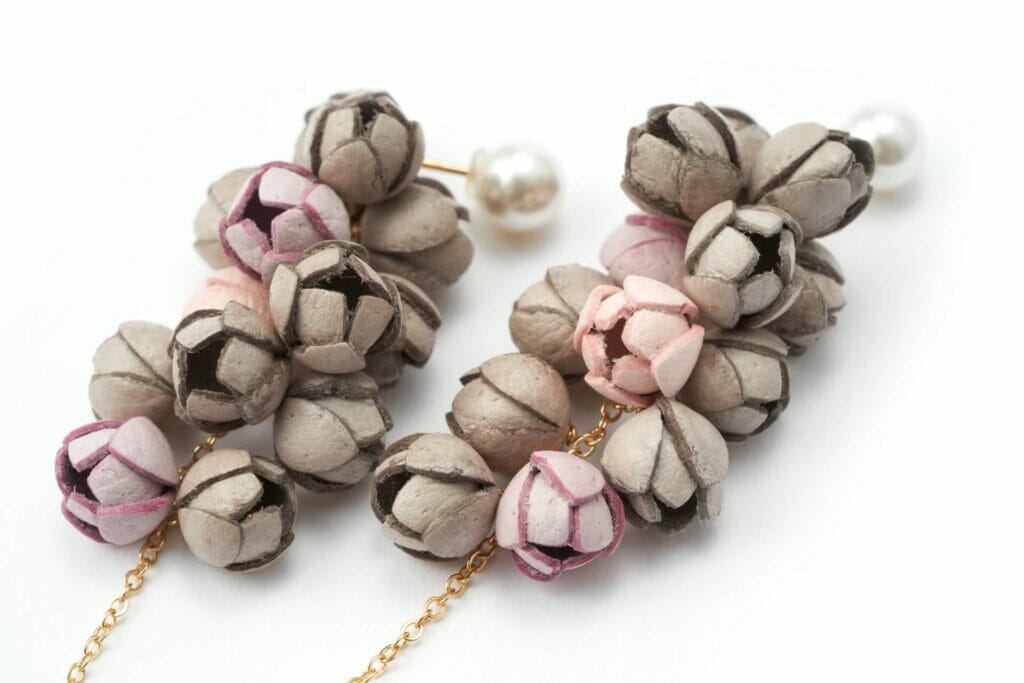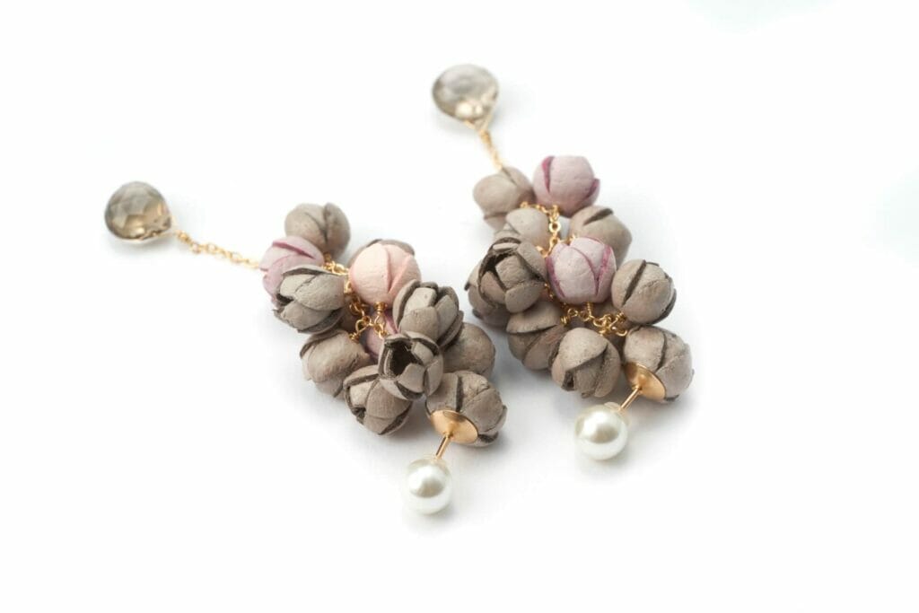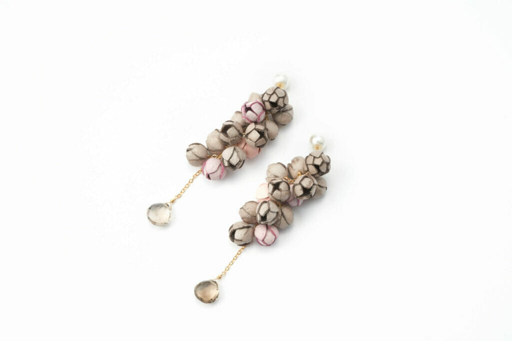 Selieu,手工珠寶品牌,主要使用日本東京名產-生活副產物豚皮為材質製作珠寶首飾。選用柔軟優質的日本國產豚皮、天然寶石及珍珠,製作出高級質感並可玩味色彩的配飾。這款搭配具衝突感的美麗色彩耳環,將煙燻粉及沙灰色花瓣混搭串連設計,特別挑選可襯托膚色的煙燻色調突顯質感,天然寶石則選用煙水晶。珍珠扣環式的耳環也可調換前後方向,用不同方式配戴。