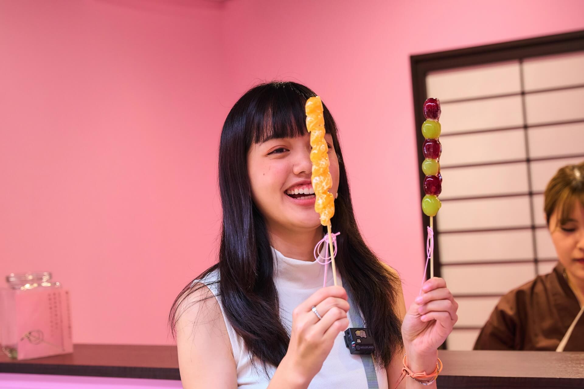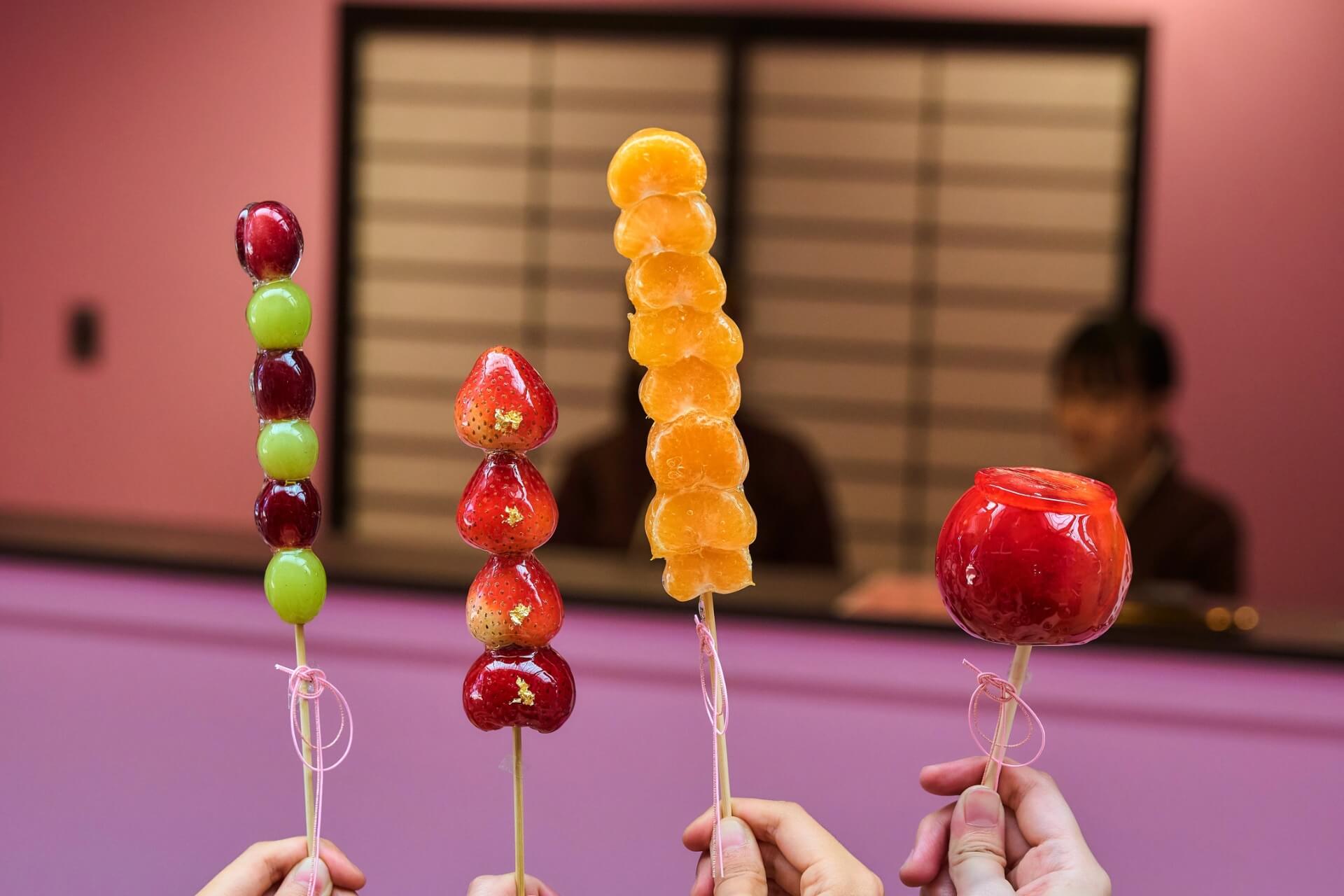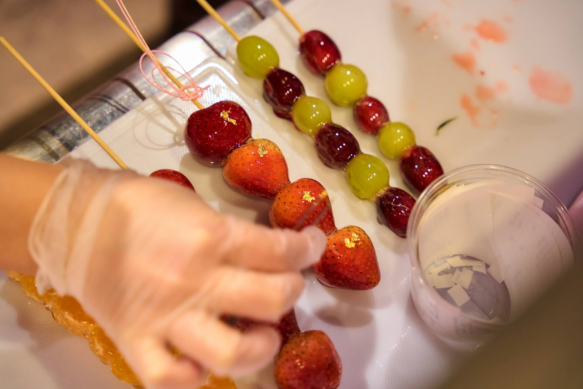 將草莓、葡萄等新鮮水果裹上糖衣,製作成頂級新口感水果糖,酥脆的口感令人愛不釋手。蘋果還可選擇切片款,讓人輕鬆享用。非常適合買來邊走邊吃。