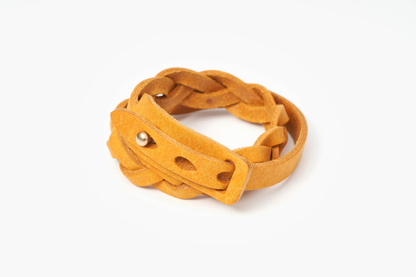 將一張皮革編織成三股辮子的雙層手環,因其充足的分量感在著用時可突顯手部存在感。越使用皮革將越顯光澤,轉化成帶有韻味的顏色,令人越加愛不釋手。