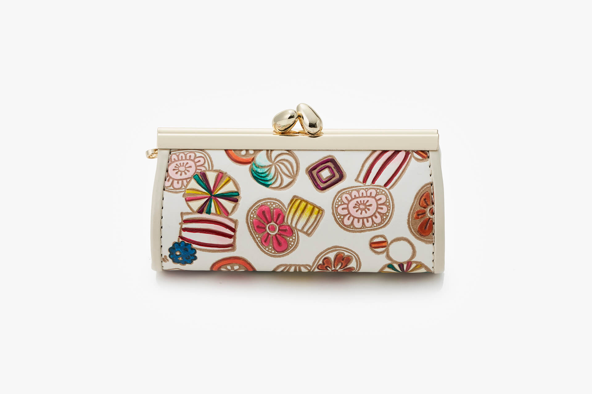 採用文庫皮革製成的收納包,在皮面上加入金太郎糖及金平糖等多種日本傳統可愛糖果圖樣。包包側片的心形形狀更為代表特色,每次從包包取拿物品的瞬間皆令人期待。