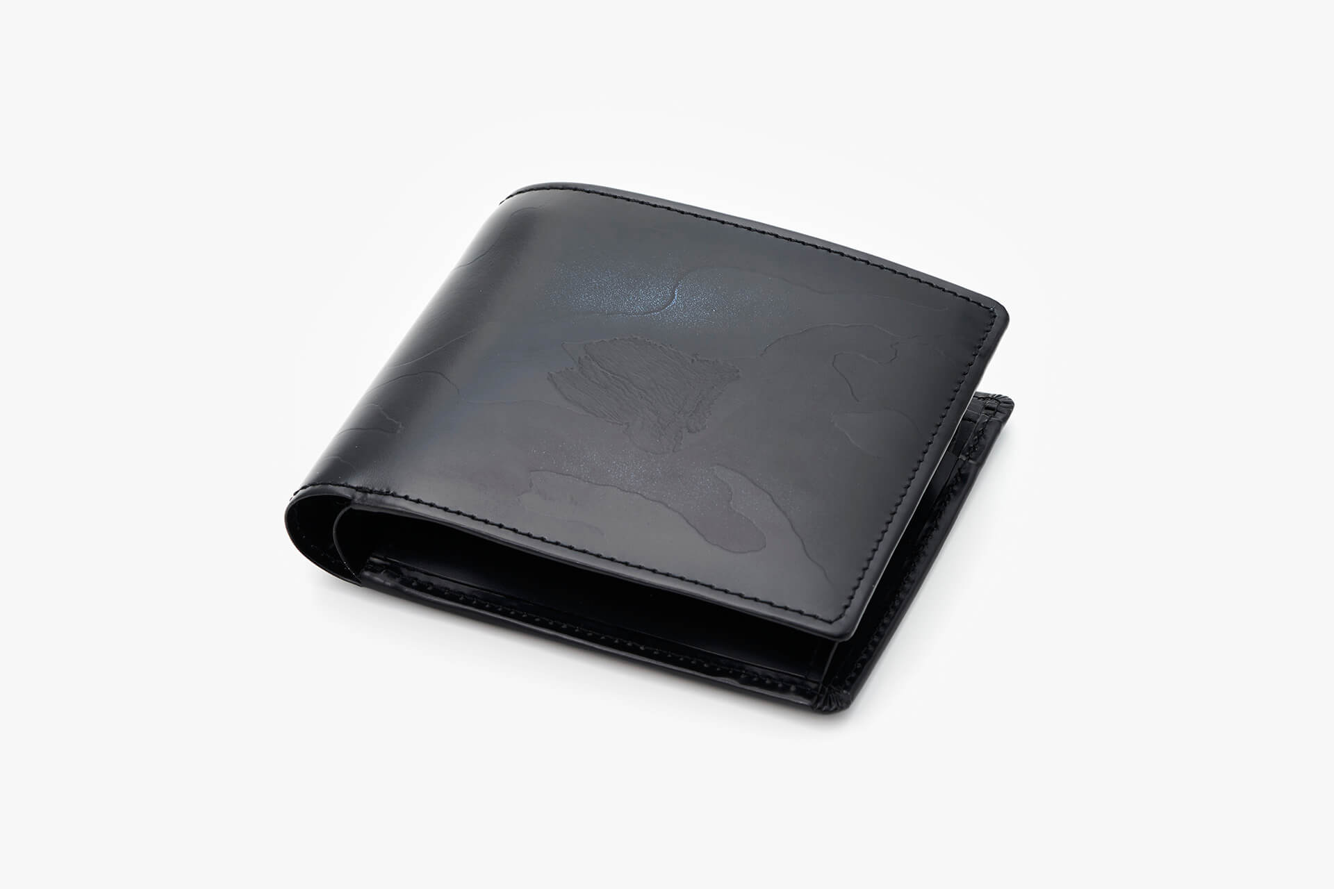 結合如塗漆般的抛光光澤與將自然姿態以迷彩式偽裝的圖紋。應用在經典的二摺式錢包上,綻放獨一無二的特色。