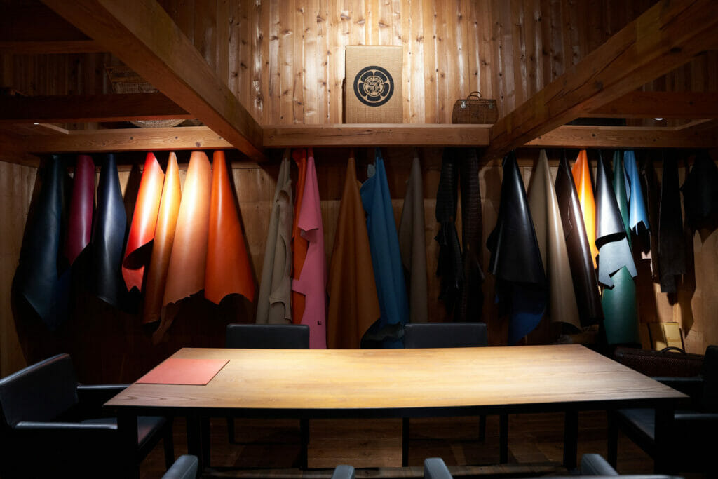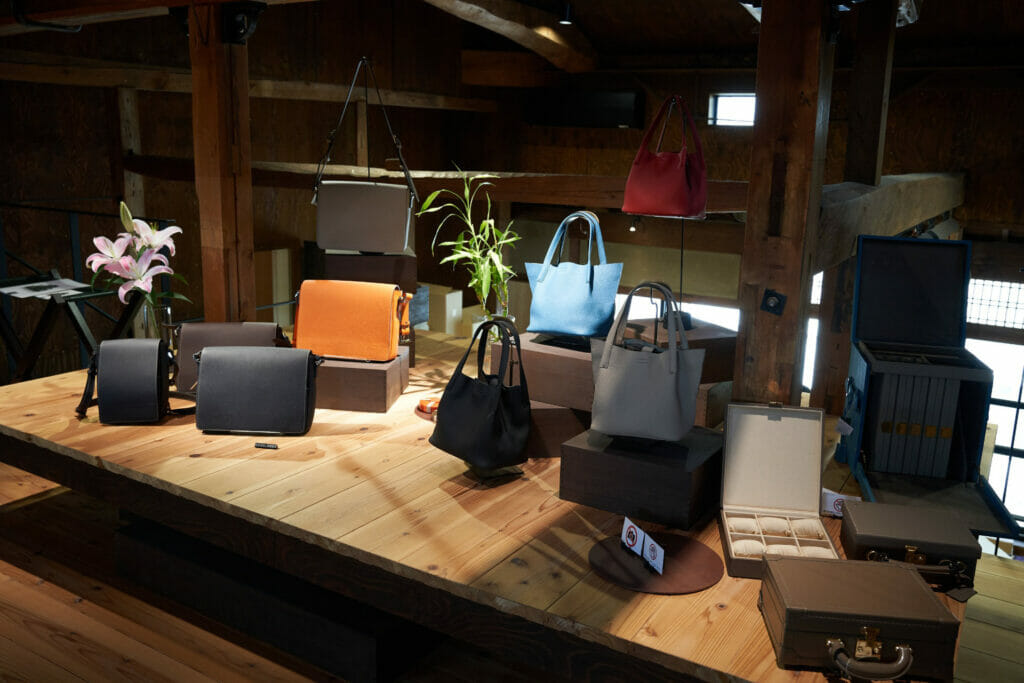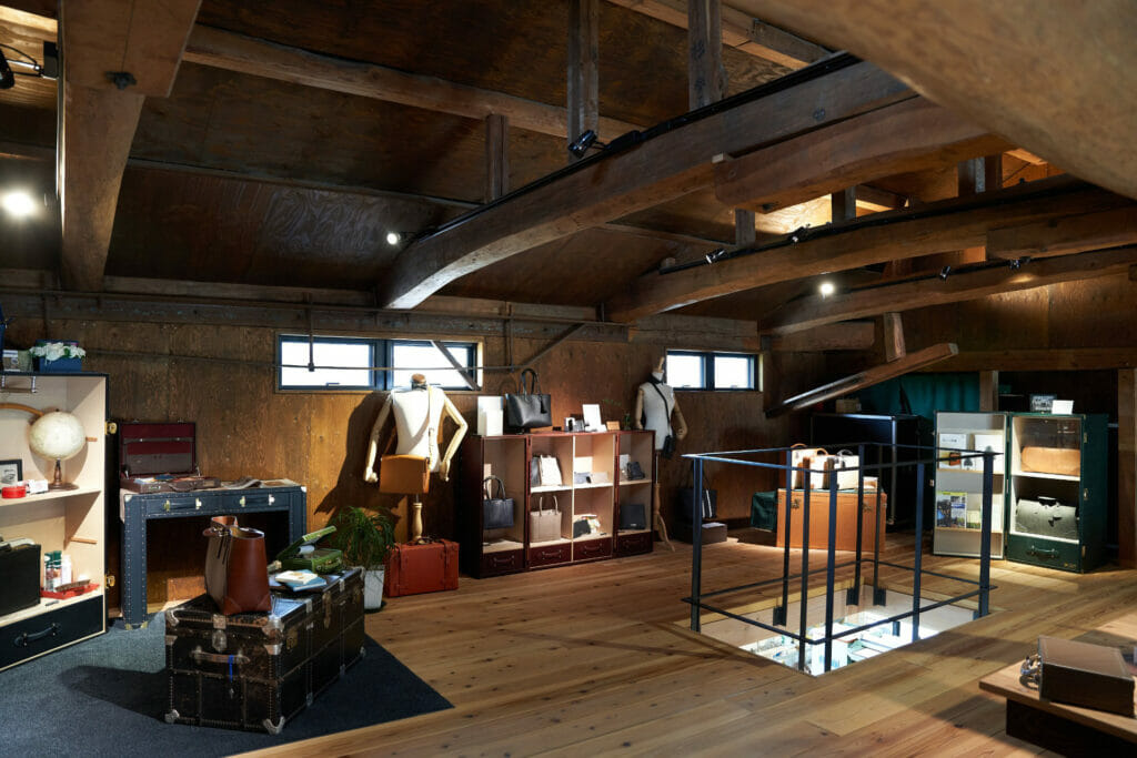 於創業超過百年的皮革工廠 Masumi 鞄嚢內開設工廠直營店。在職人們打造皮件的區域旁展出系列作品。直營店特地將倉庫改造為包款訂做專區(採預約制),不妨來這訂做一個可以陪伴一生的高級皮包。