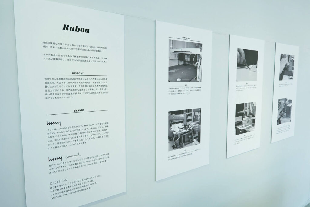 「Ruboa」是一家創立於1961年的皮革小物製造商,這裡是其直營店。該公司運用當地優秀的皮革手套製作技術,精心製作包包、錢包等各式皮革小物,並在店內進行銷售。旗下擁有已於全球展開的「hmny」、「CORGA」、「BrEAknoT」等原創品牌,產品設計不在話下,同時兼具出色的實用性。