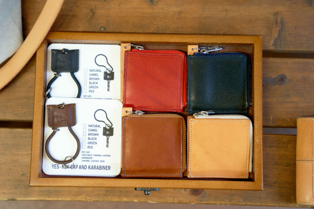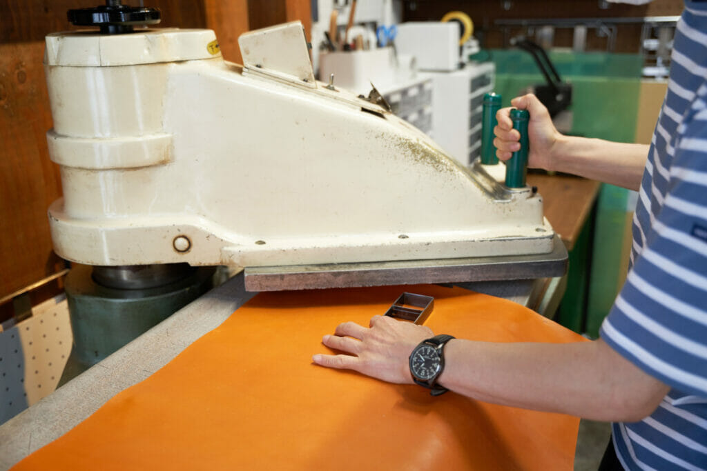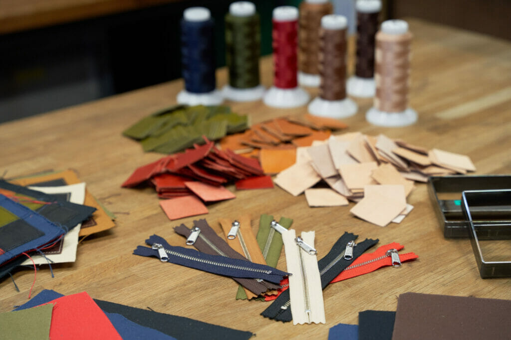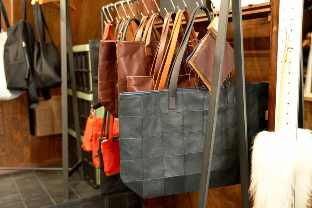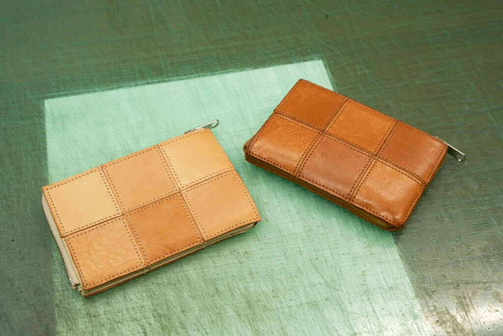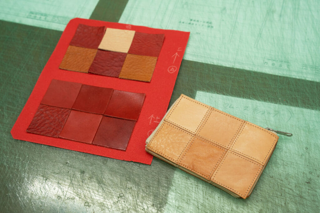 將一張皮革切割為四方形後開始製作商品。商品製作過程中,為了不產生廢料開發四方形裁片或無縫製貼合等新素材,期能推出真正好的皮革,進而創造價值。在工作坊中也常舉辦體驗活動。